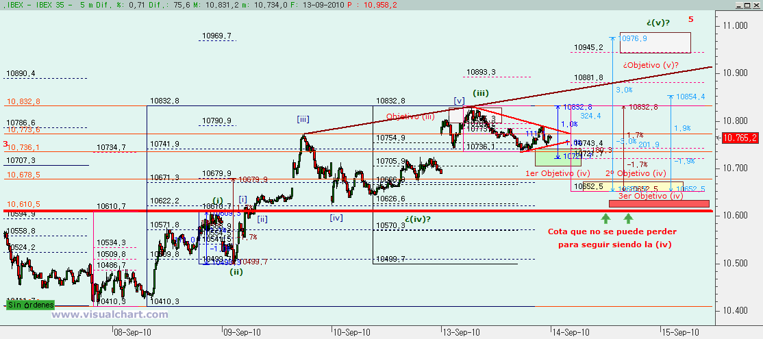 Si mañana vemos que se rompe este triángulo o se pierden los mínimos de hoy, habría que pensar en el siguiente objetivo que no es otro que el rango 10.671 – 10.652, siendo 10.671 el retroceso del 38,2% del conjunto (i)-(iii) y los 10.652 la cota que haría la (iv) igual al 162% de la (ii). Entre medias tenemos los 10.666 que son el 50% de la (iii). Esta sería la zona más probable para finalizar la (iv), pero un poco más abajo tenemos los 10.622 – 10.626 donde están el 50% del conjunto (i)-(iii) y el 61,8% de la (iii). Más allá no se debería ir. Pero de donde no se podría bajar serían de los 10.610, máximos de la (i). Esta es la cota que no se debe perder nunca (y aquí el filtro que le damos es muy pequeño).