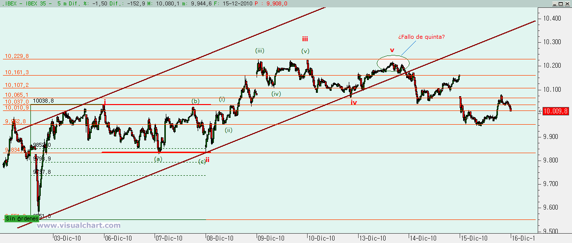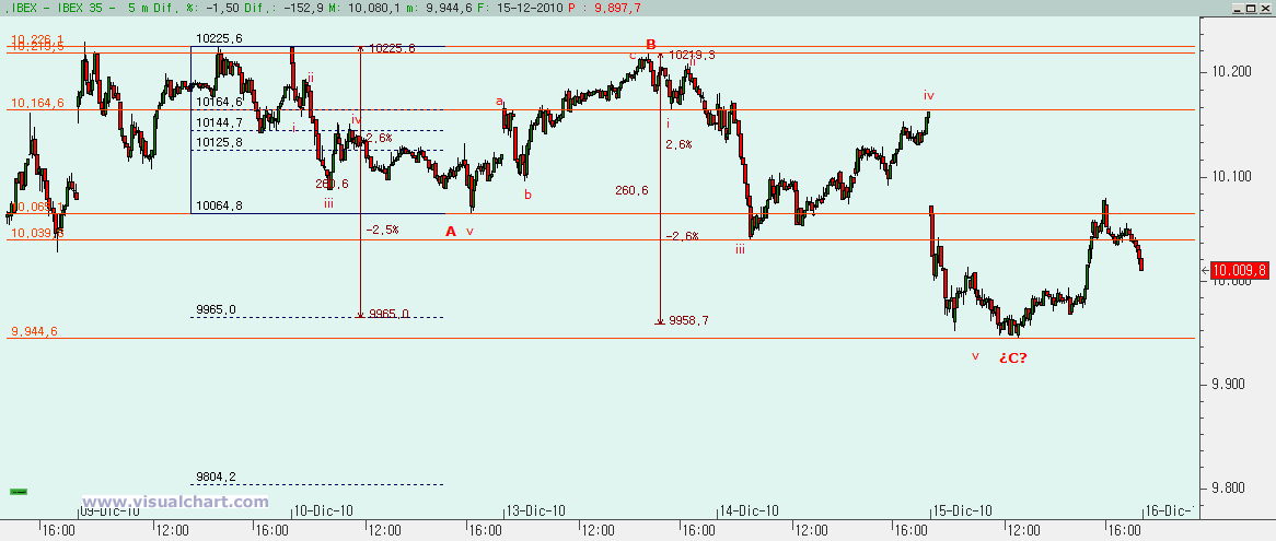 Psicoblog. Miércoles 15 de Diciembre de 2010: Desde que terminó el tramo de caída iniciado en los máximos de Octubre hemos venido intentando encontrar el recuento correcto para este rebote. Dijimos en su momento que lo normal era llegar a la zona de la 4 del impulso bajista previo, es decir, a la zona de los 10.400. Y si esto era un rebote, lo normal era hacer una ABC, aunque podríamos tener alguna otra forma más complicada de hacerlo. Tras la sesión de hoy seguimos sin llegar a descifrar el recuento correcto, pero vamos a intentar ver las posibles opciones.
