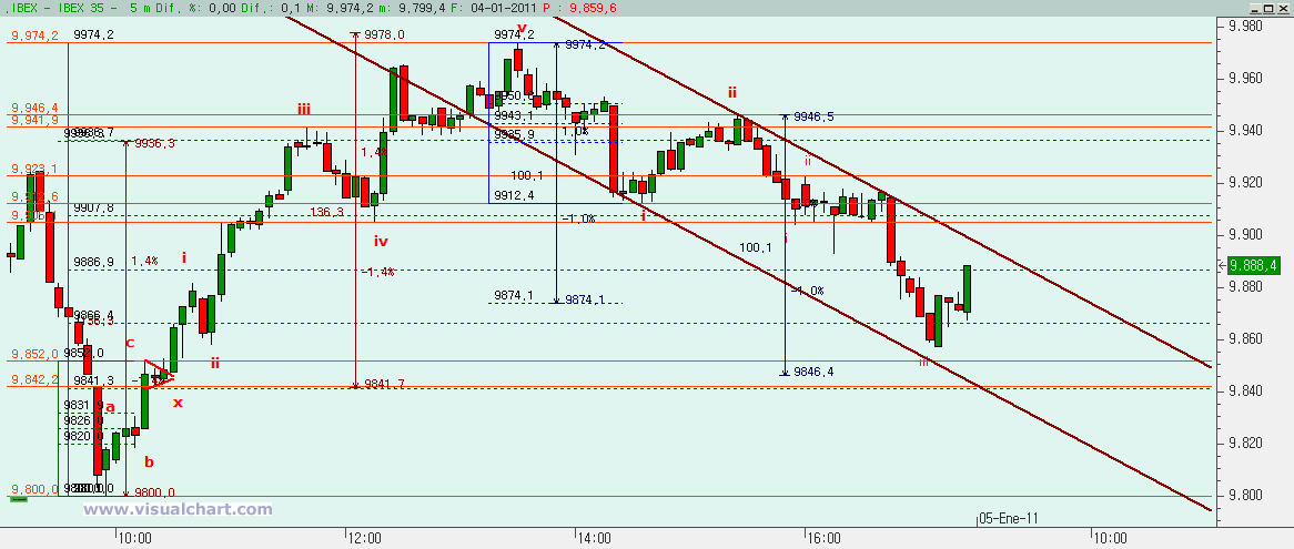 Martes 04 de Enero de 2011: Ayer señalábamos en nuestro recuento de las últimas sesiones que se estaba formando una ABC bajista, estando en la parte final de la C. Dijimos que la C se estaba haciendo en 5 ondas y que podíamos haber terminado la iii de esa C ayer y que habría que formar la iv y luego la v. Señalamos como zona de posible cortos los mínimos de la i de la C en los 9.924 para irnos a la zona de los 9.837. Hoy hemos visto que al comienzo de la sesión hemos visto un rebote hasta los 9.925 para luego caer, incluso por debajo de los 9.837, llegando a los 9.800. Pero una vez terminada la v de la C, debíamos rebotar. Y así lo hemos hecho. Veamos ahora lo que nos sale en los gráficos a muy corto.