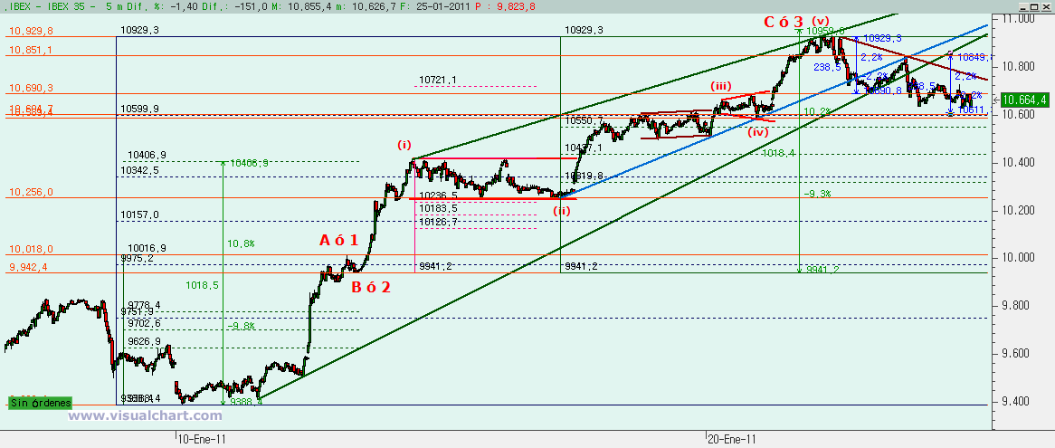 Si miramos el gráfico de 5 minutos desde que comenzó este último rebote, el recuento se nos hace complicado, pero hemos puesto uno posible. El caso es que vemos que la posible C ó 3 terminó en la zona más o menos previsible (siendo casi igual al 162% de la A ó 1). Y desde ahí hemos caído, y ahora hay que ver si definimos la subida como ABC o como 5 ondas faltando la 5 (y esta caída es la 4). Tenemos una cuña ascendente marcando esta subida, cuña rota a la baja, lo cual es una señal bajista. Digamos que si esta caída fuera una 4, el primer objetivo estaría entre los 10.550 (retroceso del 38,2% de la posible 3) y los 10.599 (retroceso del 23,6% del posible conjunto 1-3). Además, si esta caída desde máximos del Viernes pasado fuera una ABC y la C fuera igual a la A, entonces el objetivo estaría en los 10.610. Luego ya tenemos un primer rango objetivo entre los 10.550 -10.610.
