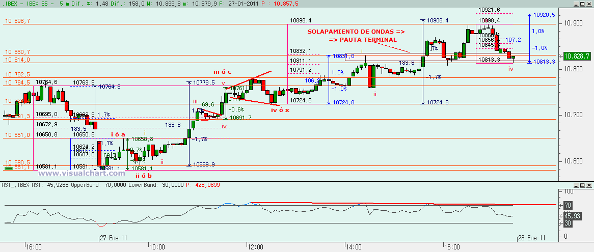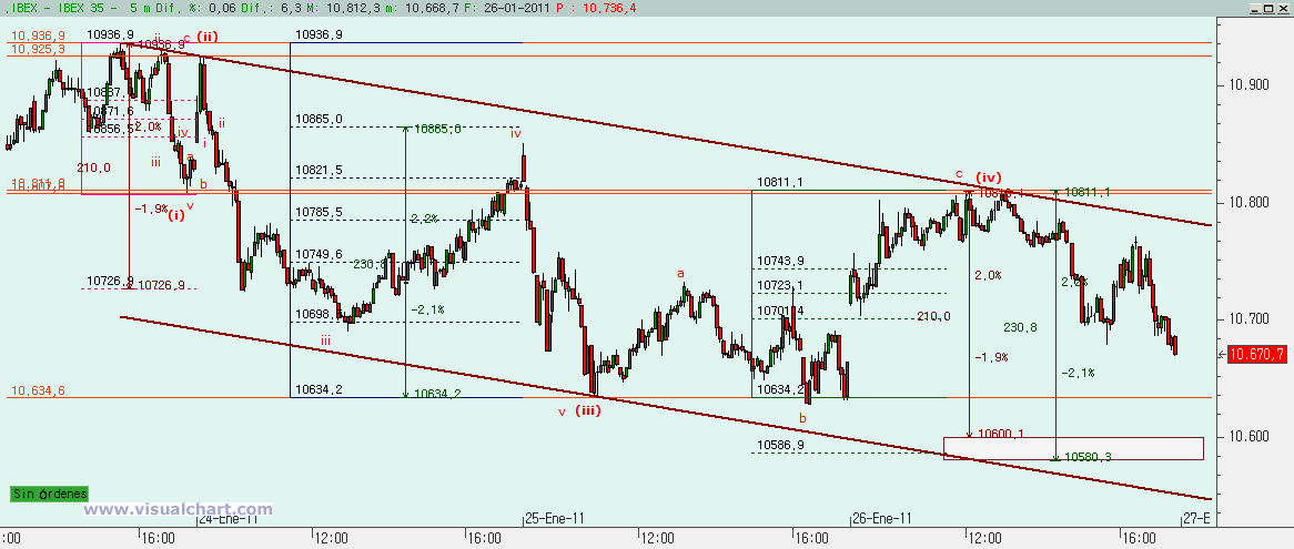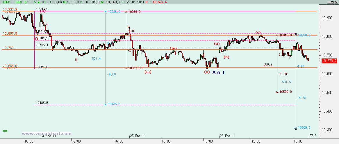 Jueves 27 de Enero de 2011: Anoche señalamos en nuestro análisis diario 4 posibles escenarios de corto tras el cierre de ayer. A primera hora de la mañana descartamos uno de ellos y muy pronto dijimos que, tras iniciar la sesión a la baja, debíamos fijarnos en la zona de los 10.580-10.600, porque nuestro escenario 3 marcaba ese rango como objetivo bajista antes de un rebote a la zona de los 10.800. Y ahí rebotamos con fuerza, cuando todos creían que la rotura de mínimos de pasados días nos llevaba más abajo. Y al final subimos aún más de esos 10.800, pero si superar los máximos del día 21. Ahora veamos lo que puede suceder mañana.