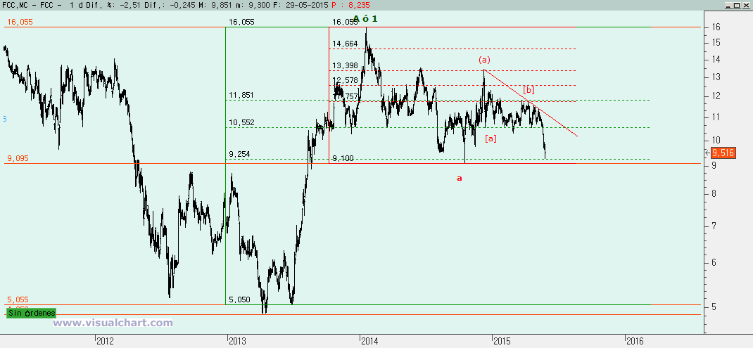 Tras un año de subidas vertiginosas al calor de entrada de inversores internacionales en FCC, puedes comprobar que el valor está correctivo desde ese máximo de enero de 2014. Más de un año de corrección que ha llevado al valor a la zona del 61,8% de esa subida.