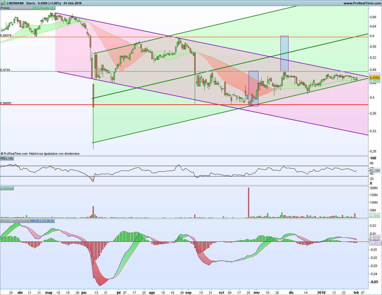 Análisis técnico Liberbank 1 febrero 2018. Ya hace algún tiempo del pánico en el banco. Fue a raíz de todo lo sucedido con el Popular, y hubo que prohibir los cortos en el valor para evita su caída. Y desde entonces Liberbank ha recuperado algo de terreno, pero no mucho.