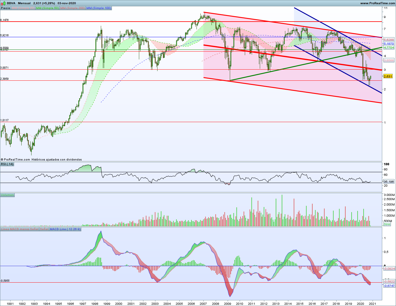 BBVA, como otros bancos, ha presentado una tendencia bajista muy acusada, acentuada con la crisis Covid-19. Los máximos de 2007 se han visto desde muy lejos en estos últimos años, lo que denota la gran debilidad del banco. La irrupción de la crisis Covid-19 rompió la alcista desde los mínimos de 2009 y eso provocó un nuevo derrumbe que llevó a los mínimos de 2009. Ese mínimo propició un rebote hasta junio. Pero de nuevo volvieron las caídas y pareció que en septiembre y octubre se perdía ese soporte, lo que debía desencadenar una caída aún mayor. Pero lo que hemos visto han sido dos velas con mecha inferior larga para cerrar aún por encima del soporte. Eso significa que el soporte sigue siendo válido. Pero, ¿también significa que para el BBVA mejora la situación?