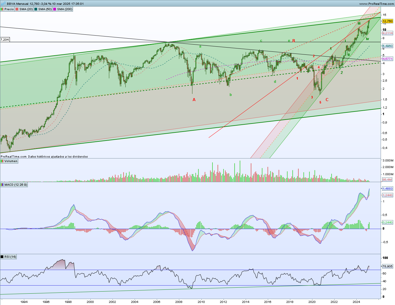 Hace ya varios años te advertí que BBVA podía haber hecho suelo y haber terminado la corrección iniciada tras los máximos de 2007. Primero se había roto la 2-4 de la onda C correctiva, después se rompió la 0-B de ese ABC correctivo y eso implicaba que debía venir un nuevo impulso alcista. Pues bien, la subida ha sido muy fuerte y continuada y eso ha llevado a BBVA a máximos históricos (descontando el dividendo) y a meterse en subida libre. Pero, ahora hay que preguntarse si para el BBVA ha llegado el momento de un alto en el camino. Vamos a ver los gráficos.