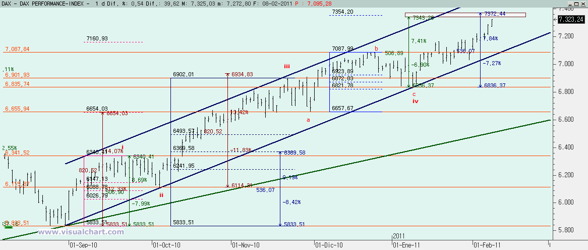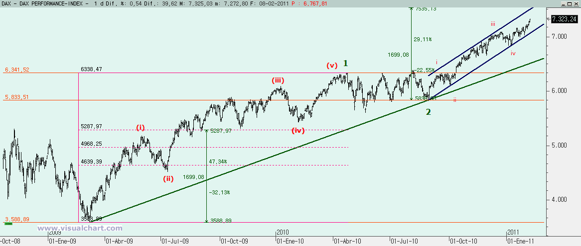 DAX: El recuento desde mínimos de Marzo de 2009 es análogo al del Sp500 y también tenemos la duda de si ahora estamos haciendo la 5 desde esos mínimos o ya hicimos 5 alcistas en lo que sería la 1, luego la 2 y ahora estamos comenzando la 3. Si estuviéramos comenzando la 3 querría decir que estamos en la (i) de esa 3, y que no deberíamos perder la directriz 0-2 antes de alcanzar los 7.535. Además, como la 2 no alcanzó ni de lejos el 50% de la 1 en la corrección, la superación de los máximos de la 1 fueron una señal alcista clara.