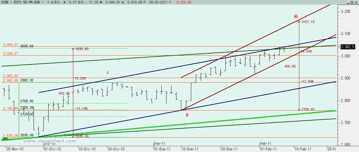 Euro Stoxx: Euro Stoxx presenta una situación muy interesante ahora mismo, porque el recuento desde mínimos de Marzo de 2009 nos diría que hicimos una primera alcista hasta Enero de 2010 y luego hemos estado haciendo una 2 hasta los mínimos de Noviembre de 2010. Desde entonces podríamos haber comenzado la 3. Si así fuera, la directriz 0-2 no se debería perder bajo ningún concepto antes de alcanzar cotas muy superiores (hasta que la 3 no sea igual, al menos, al 61,8% de la 1). Ese sería el stop para los alcistas. Pero decimos que la situación es muy interesante porque la superación de los máximos de la 1 (y hoy hemos cerrado ahí mismo) sin haber corregido ni el 50% de esa 1 en la 2 sería una señal de largos muy clara.
