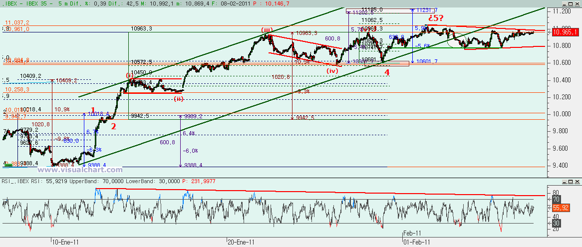 Y si hacemos un zoom en el gráfico para quedarnos con la 3 en el gráfico de 5 minutos, seguimos teniendo la duda de si hemos terminado la 5 de esta 3 (es decir, si hemos terminado la 3 entera) o si estamos aún haciendo la 4. Parece que podemos estar haciendo un triángulo, pero tampoco confiamos mucho en eso. La pérdida de la directriz alcista del canal seguido en la 3 parece indicar que sí que ha terminado, pero teníamos un objetivo algo por encima. De todos modos, si lo que estamos haciendo ahora fuera la 4 ya, entonces el objetivo debería estar, al menos, en los 10.600, aunque lo más probable sería ir más abajo, a la zona de los 10.400. Pero nunca por debajo de los 10.250. Eso sí, si hemos terminado la 3. Si no la hemos terminado (y si el resto de índices parece que tienen que subir más, con lo que podríamos tirar más), entonces habrá que esperar a ver cuándo termina. La superación de los máximos del otro día podría ser la señal de que estamos aún en la 3 (y es que una 4 no podría ser tan corta).