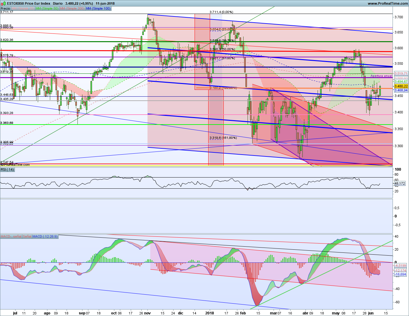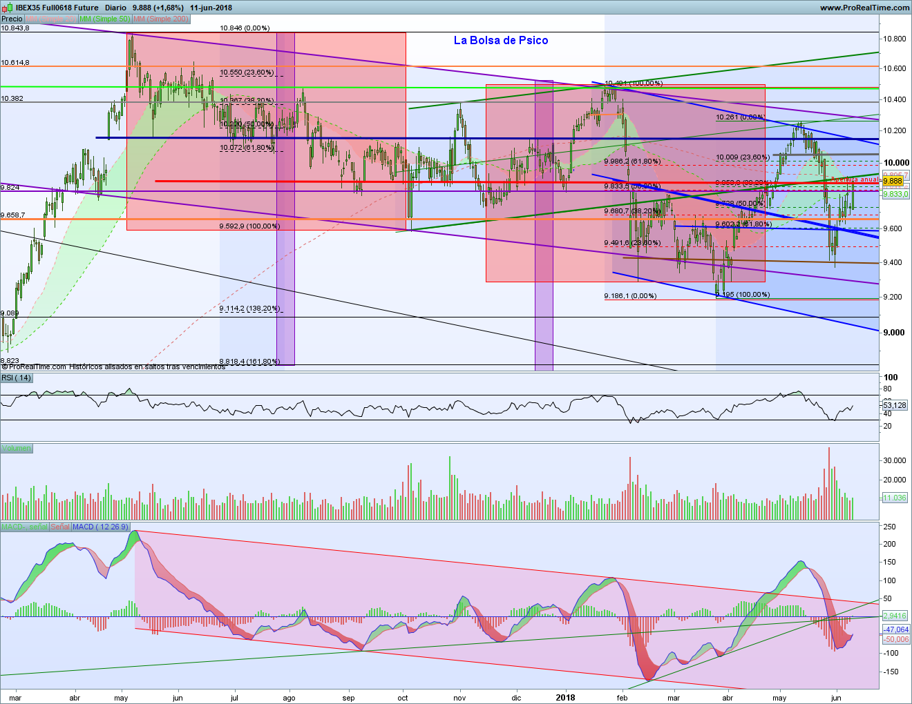Análisis Técnico de La Bolsa de Psico de las Bolsas Europeas 11 junio 2018. Continúa estirándose el chicle. Hoy ha tocado volver a la parte alta del lateral. Y volvemos a hacernos la misma pregunta. ¿Será para romper por arriba o para volver hacia la parte baja del lateral de nuevo?