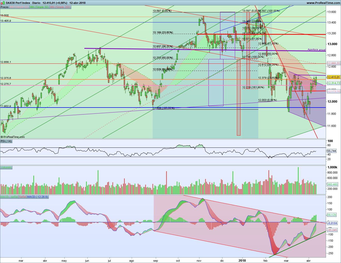 El Dax se había dado la vuelta al llegar a la resistencia morada marcada por los máximos de marzo. Sin embargo, ayer, la caída llegó al primer nivel de soporte, el rosa. Y desde ahí ha vuelto a subir hoy para volver a la resistencia morada. Por tanto, ya tenemos un lateral con dos límites a vigilar. Por el lado que se rompa marcará el movimiento posterior.