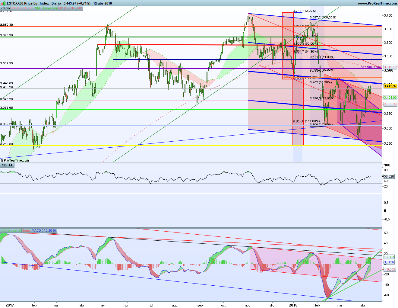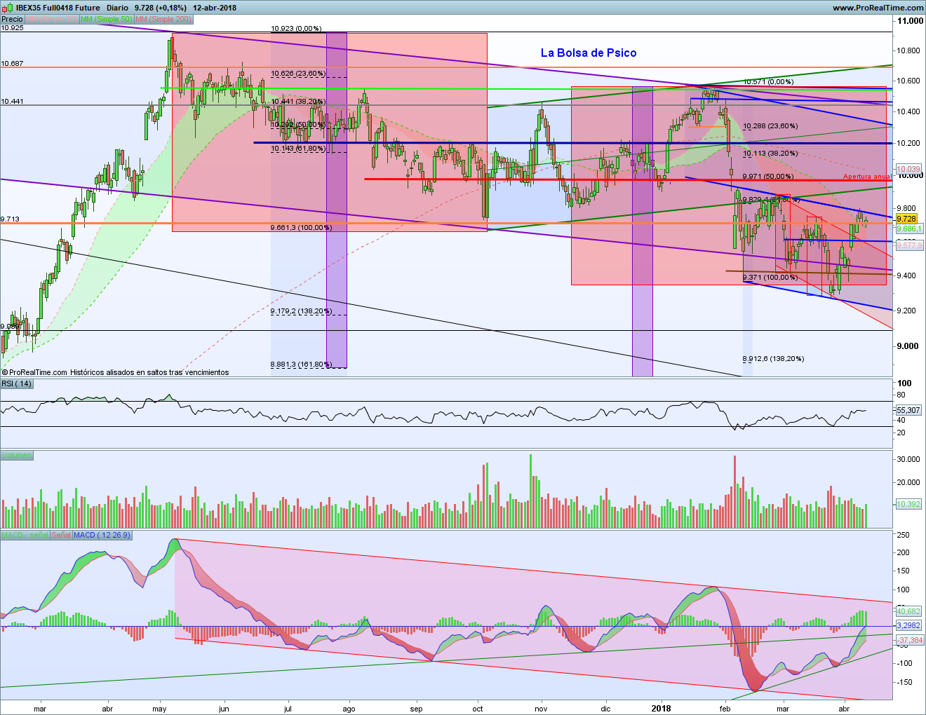 Análisis técnico de La Bolsa de Psico de las Bolsas Europeas 12 abril 2018. Tras la caída de ayer las bolsas han retomado hoy el impulso volviendo a la casilla de salida de hace dos días. Es decir, han vuelto al mismo sitio donde se frenó la subida hace dos días… Y hace un mes…