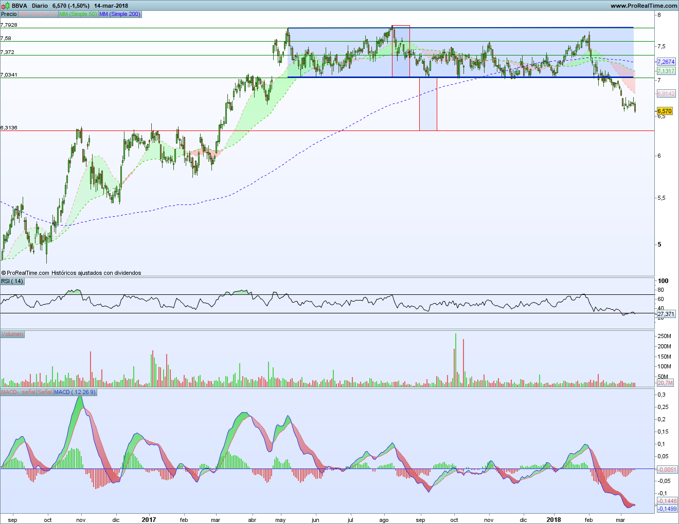 En ese 6,31 veríamos al banco jugarse los cuartos para ver si puede volver hacia arriba o no. De momento el MACD tampoco da buenas noticias, ya que hoy parecía que podía cortarse al alza (aunque sin divergencias alcistas). Pero se ha vuelto abajo. Y deja un pequeño fallo que parece apuntar hacia ese objetivo bajista.