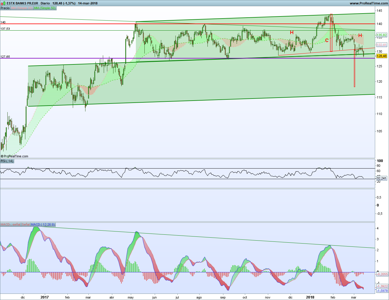 Pero el peligro está en esa figura de HCH que se formó. Una figura confirmada con la rotura de la clavicular. Y con un posible pull-back hecho. Eso nos daría una proyección bajista hasta la zona del 118. Y marcaría una caída aún importante. Y como el Ibex es un índice con tantos bancos, serviría todo para que no pudiera subir.