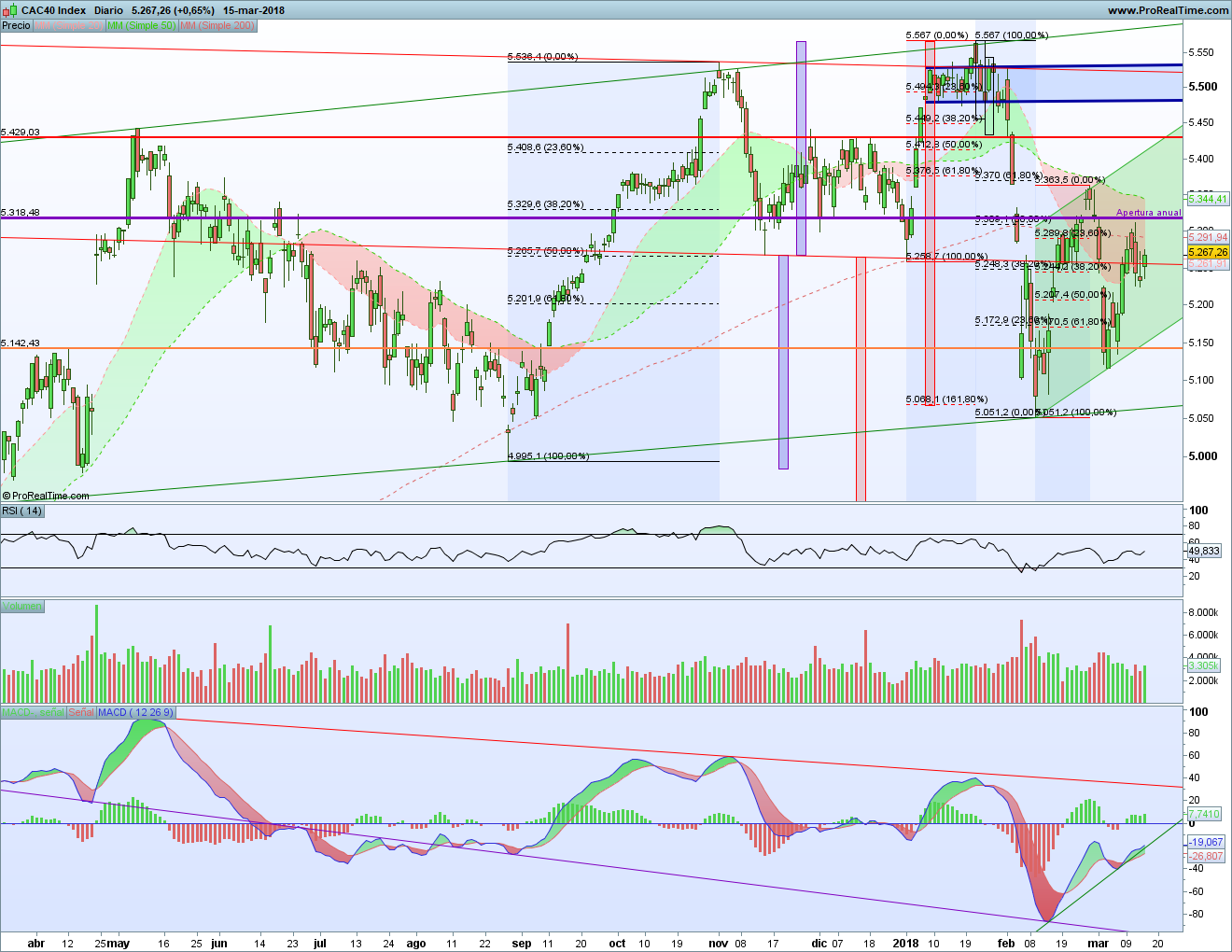 El índice francés vuelve a meterse por encima de la línea roja. Esa línea era la clavicular del doble techo. Y por eso es tan importante ver lo que ocurre. Si se supera, volveremos a ver un ataque a la resistencia morada, marcada por la apertura anual. Antes está la MM200 que también debe marcar.