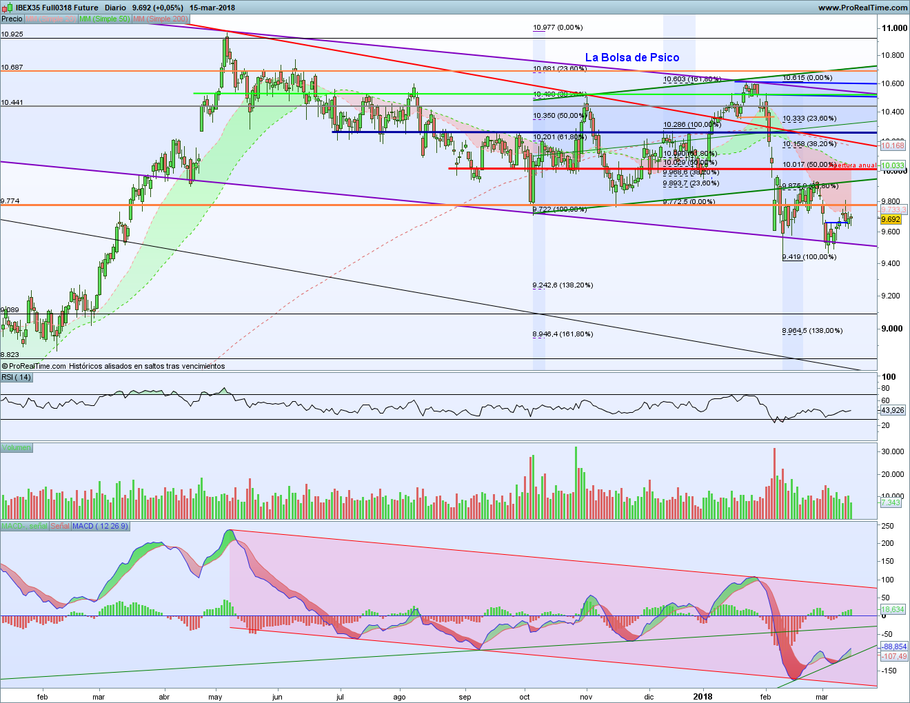 Sin embargo la alcista del MACD también manda. El que el indicador suba y el precio no lo haga no es buena señal. Pero mientras la alcista no se rompa hay que pensar que sigue el rebote. Porque en el futuro no marca divergencia, pero en el contado sí. Y mientras la divergencia alcista siga ahí, cuidado con los cortos. Lo malo es que mientras la señal bajista del martes no se anule, cuidado con los largos…. Total, como te he dicho, lo mejor es esperar a que pase el vencimiento y veamos por dónde se rompe.