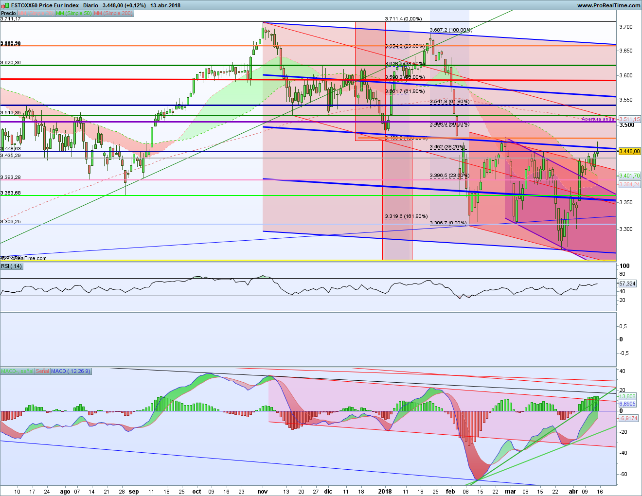 Por tanto, tenemos al Dax justo en la línea bajista decisiva tanto en precio como en el MACD. Un punto perfecto para que haya un giro bajista. Pero si se superaran las dos, entonces es que la subida va en serio. Por tanto esta semana parece ser muy importante.