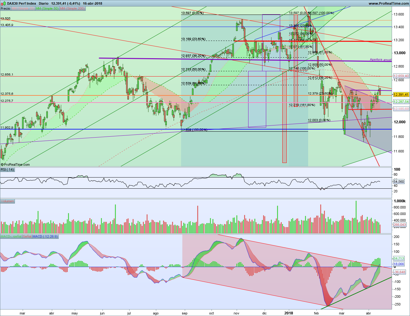 El MACD está en la zona de la bajista desde noviembre. Y también apunta a un corte a la baja. Si se confirmara, no se habría anulado la divergencia bajista desde noviembre. Y sería el momento de ver si se ataca la alcista verde que ha marcado la divergencia alcista. Como te he repetido desde hace varias sesiones, se trata de ver cuál de las dos directrices se rompe antes. La que caiga marcará por dónde va a seguir el Dax en las próximas semanas.