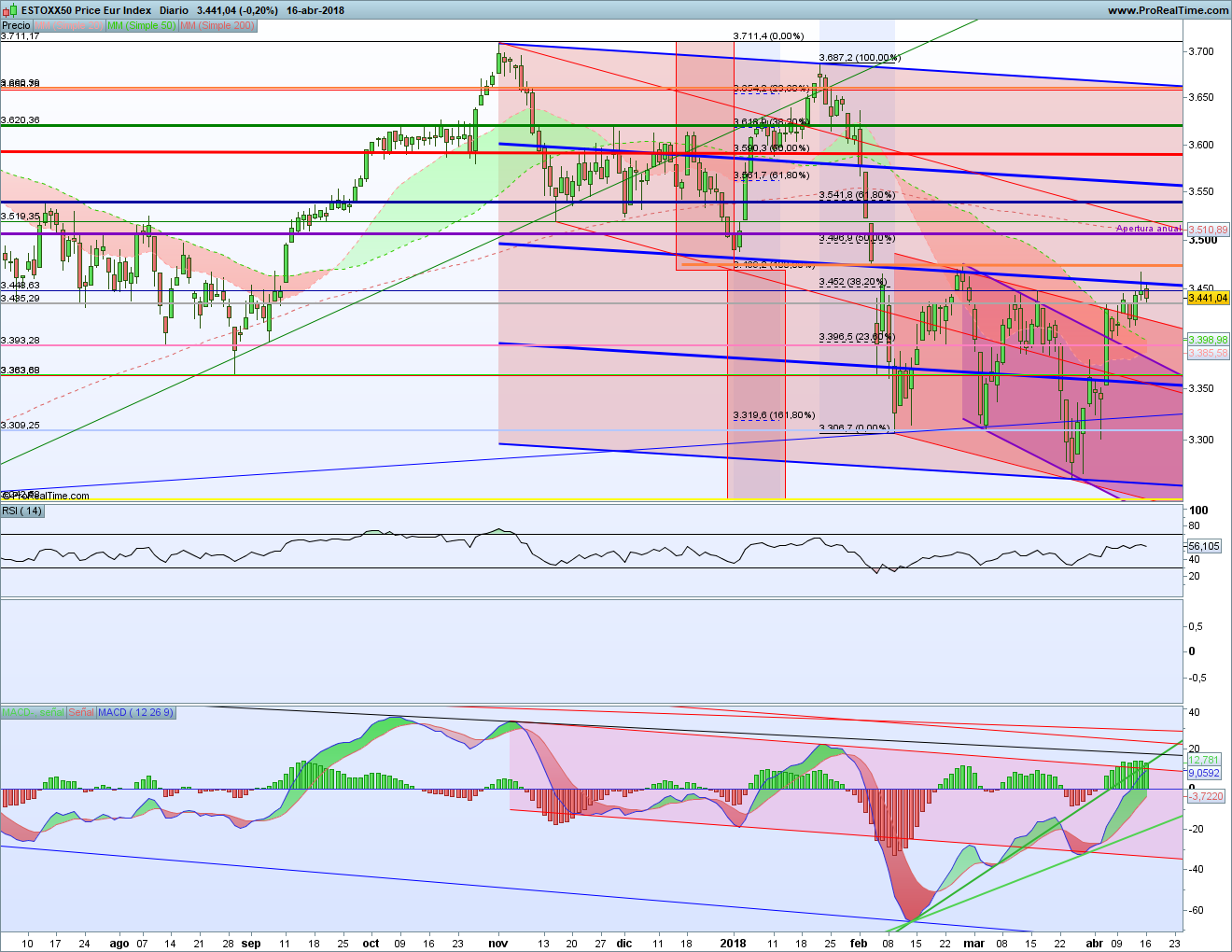 Lo peor de todo es que el MACD llega a la bajista desde mediados del año pasado, la que marcó la divergencia bajista. Si llega ahí y hay un corte a la baja, tendremos que la divergencia sigue vigente. Y habrá que mirar por abajo a la alcista que marcó la divergencia alcista. Como te he dicho para otros índices, la directriz que se rompa antes marcará hacia dónde va el índice en las próximas semanas.