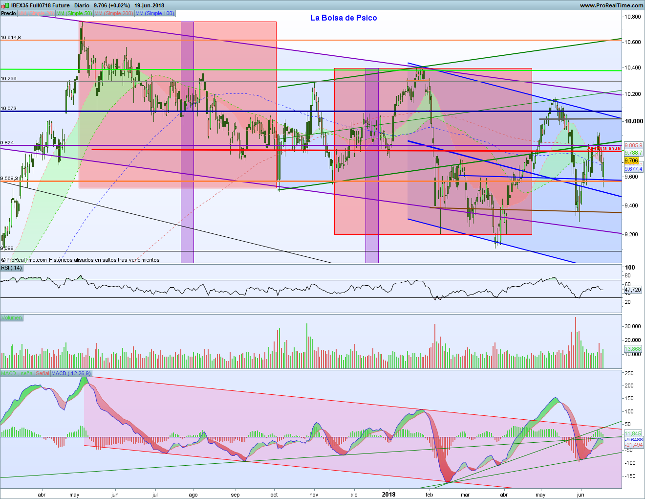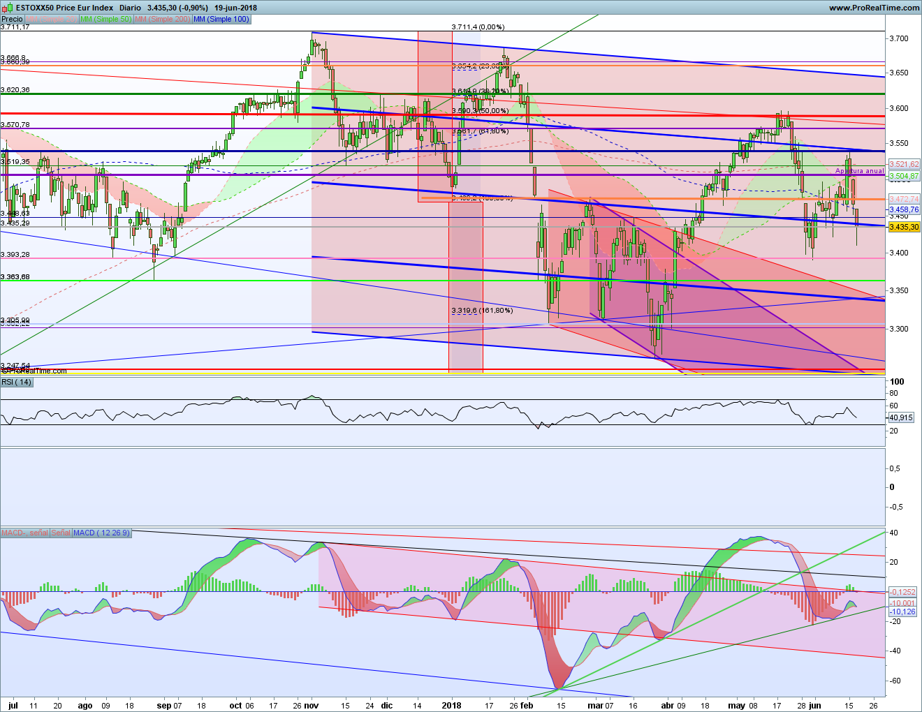 Análisis Técnico de La Bolsa de Psico de las Bolsas Europeas 19 junio 2018. El viernes los índices dejaron todos ellos un Reversal day que invitaba a cortos. Ayer tuvimos el primer trago bajista. Y hoy ha venido el segundo, mayor incluso que el de ayer.