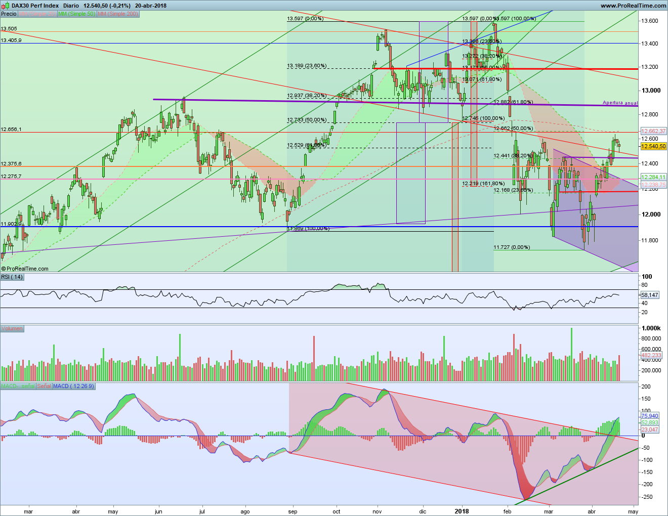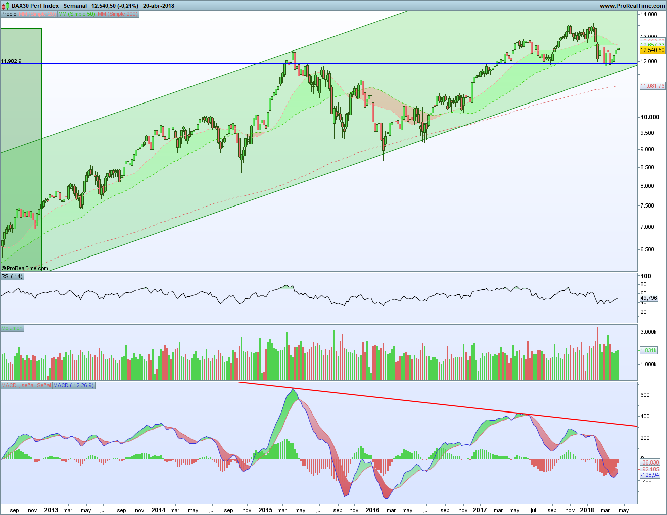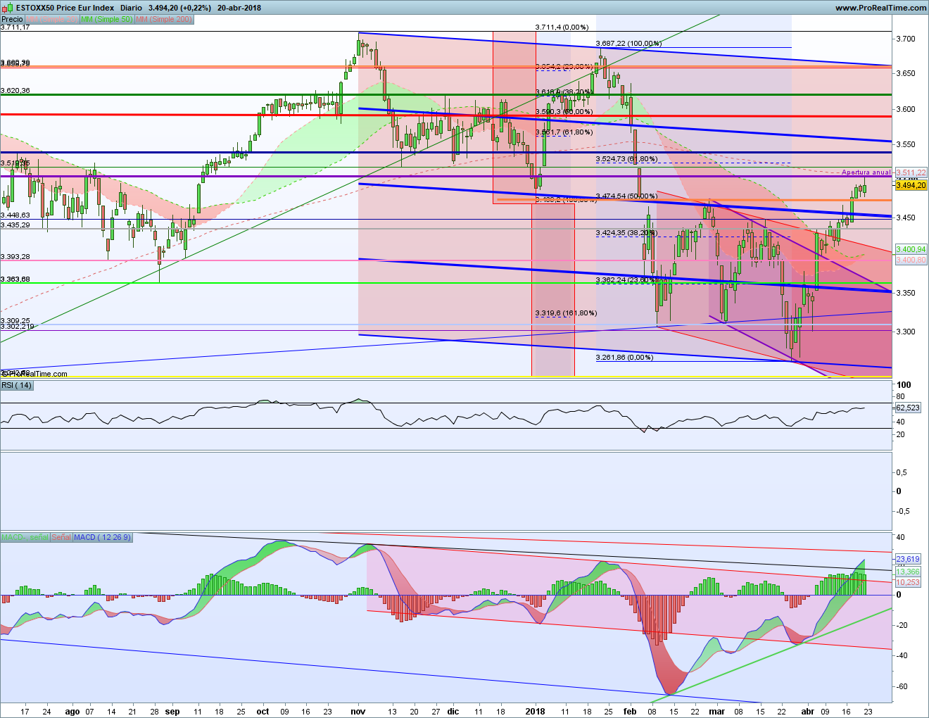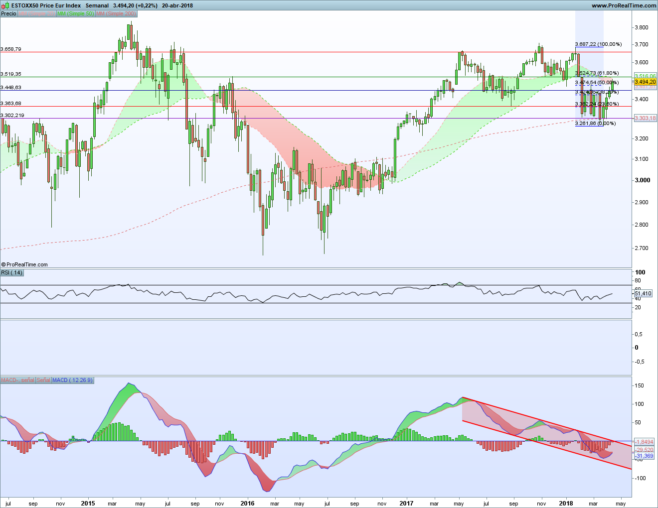 Análisis Técnico de La Bolsa de Psico de las Bolsas Europeas 23 – 27 abril 2018. Nueva semana alcista la que hemos vivido en las bolsas europeas. Y ya van 4 seguidas tras el mínimo anual. La situación ha ido mejorando y se han ido superando resistencias importantes. Ahora se trata de ver si volvemos a máximos anuales o no.