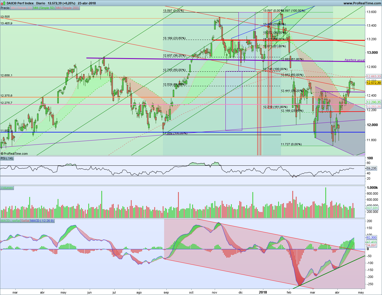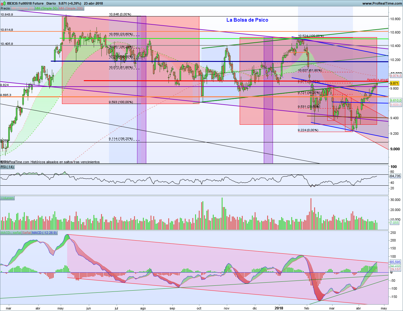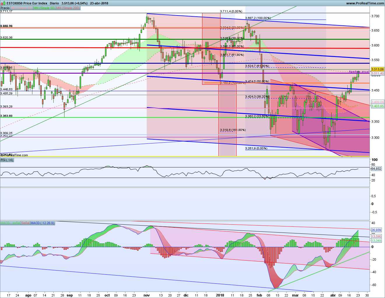 Análisis Técnico de La Bolsa de Psico de las Bolsas Europeas 23 abril 2018. Continúa la senda alcista en las bolsas europeas iniciada a finales del mes pasado. Se van superando niveles sin prisa pero sin pausa. Eso sí, cada índice en función de su fortaleza. No van todos a la vez.
