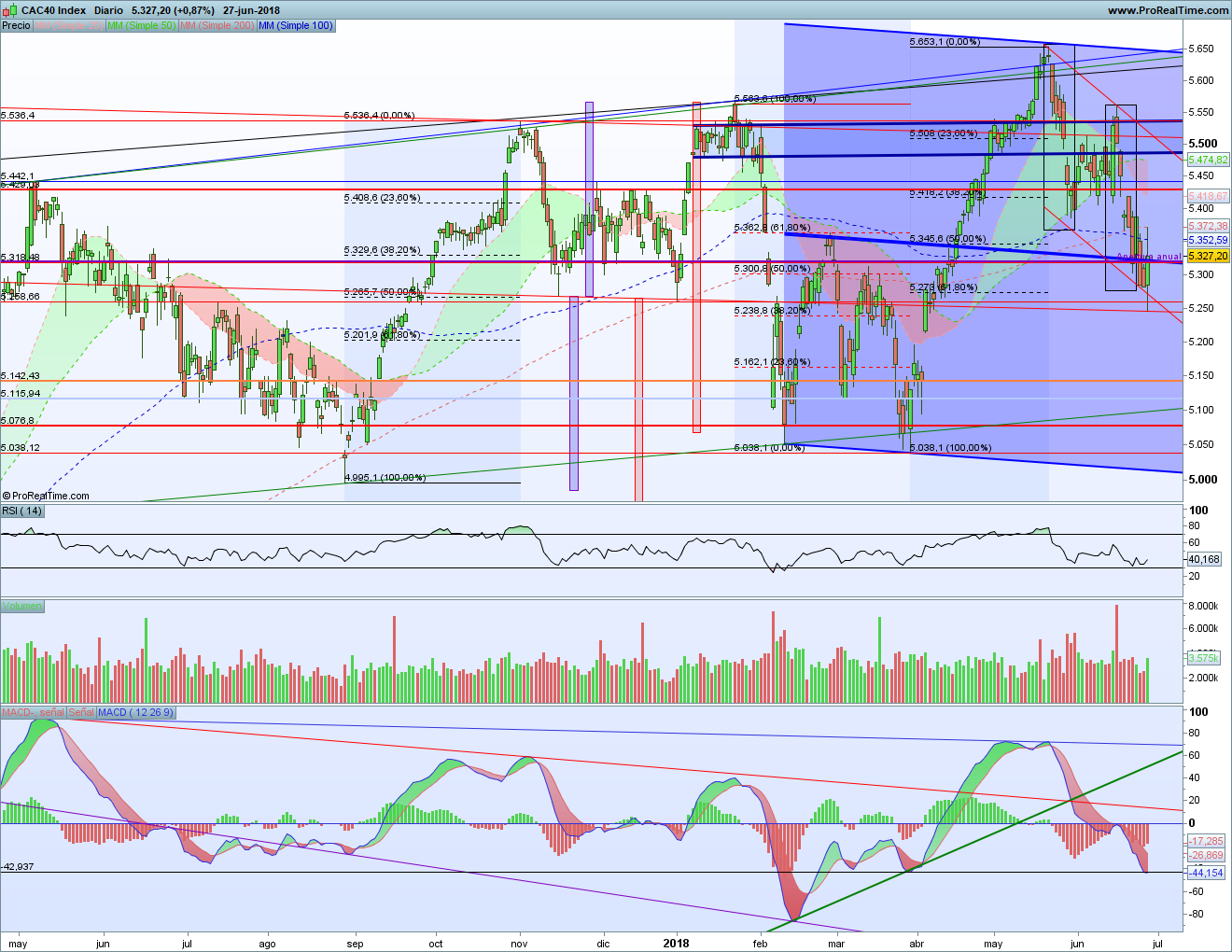 Análisis Técnico de La Bolsa de Psico de las Bolsas Europeas 27 junio 2018. Jornada movida en las bolsas europeas durante el día de hoy. Primero hemos tenido caída de importancia. Al llegar a zonas clave ha venido un rebote aún mayor que la caída inicial. Y, al final, se ha contenido todo, cerrando en verde, pero lejos de máximos y de mínimos.