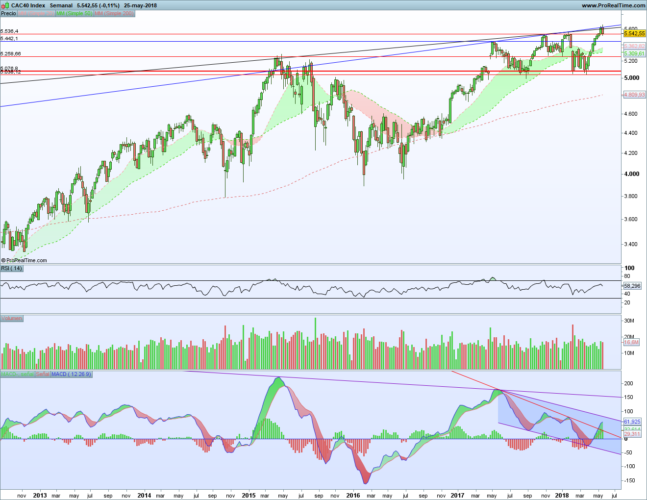 El MACD, tras romper la bajista la semana pasada, se acerca a la posible parte alta del canal bajista. Allí tendremos una nueva señal para ver si tenemos giro bajista o no.
