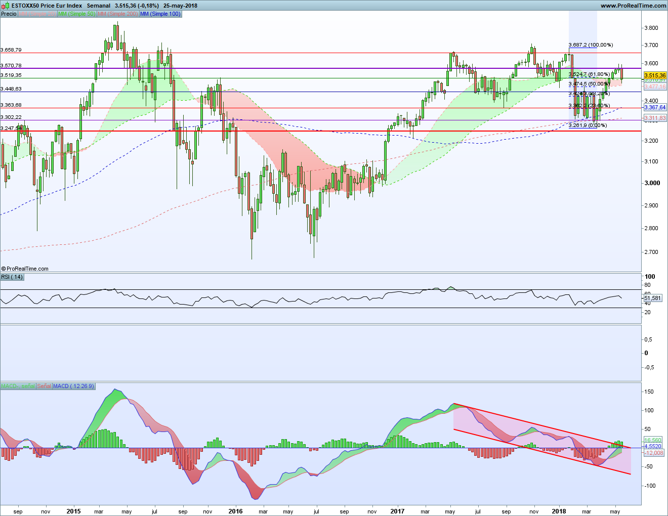 La semana pasada dejamos al EuroStoxx en la resistencia horizontal morada, con un doji que nos hablaba de indecisión. Pues bien, esta semana tenemos un rechazo de nuevo en la resistencia y una vela roja grande que forma una estrella vespertina.