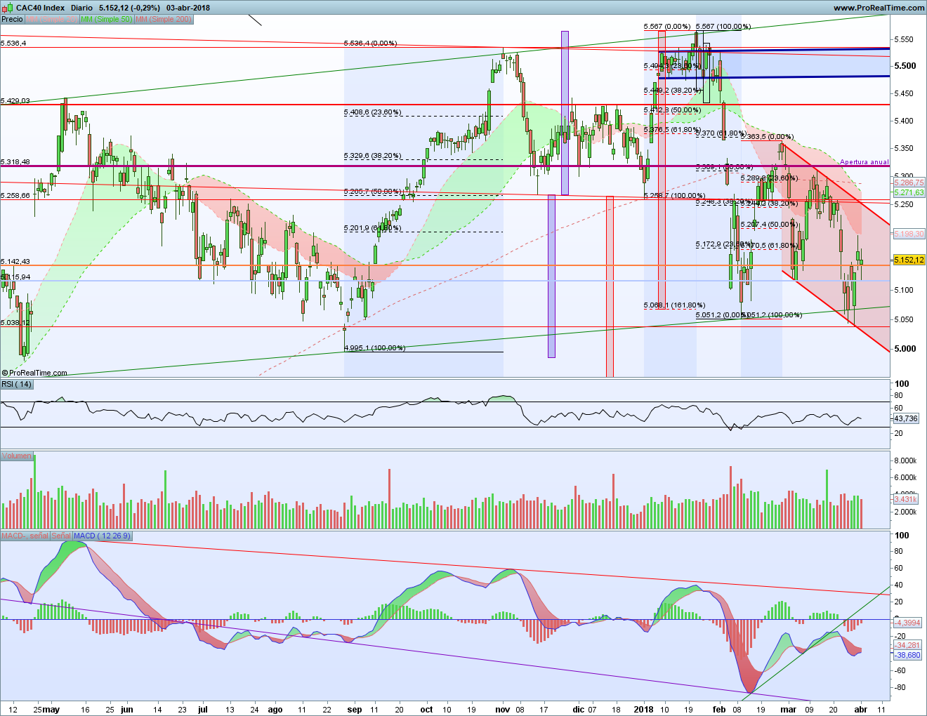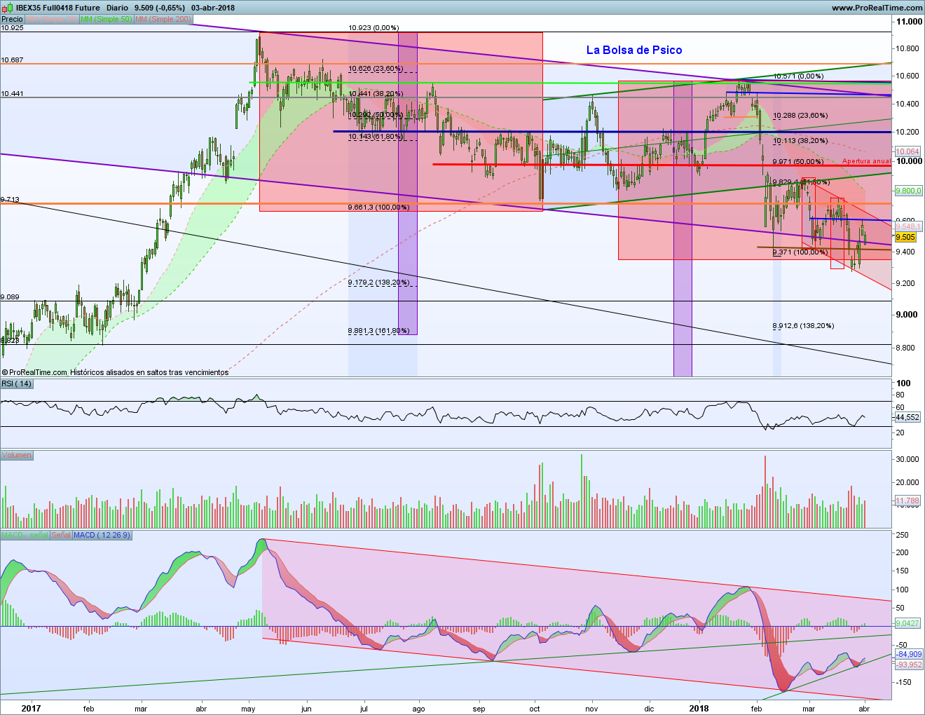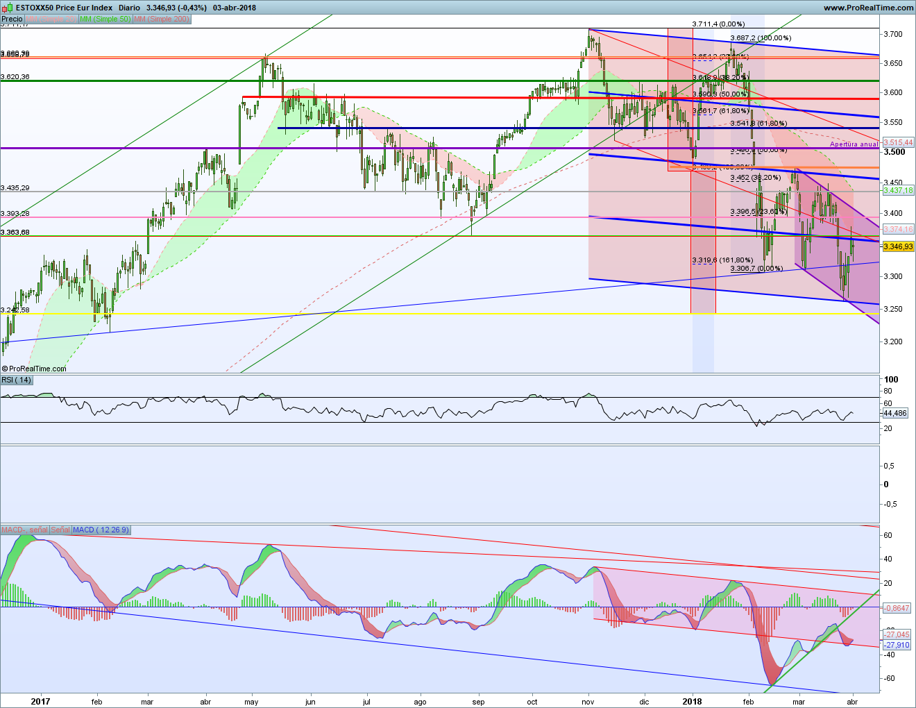 Análisis Técnico de La Bolsa de Psico de las Bolsas Europeas 3 abril 2018. Tras la caída de ayer de los americanos, con los mercados europeos cerrados, tocaba caída hoy en las bolsas europeas. Sin embargo, al cierre no ha llegado la sangre al río y las pérdidas se han limitado.