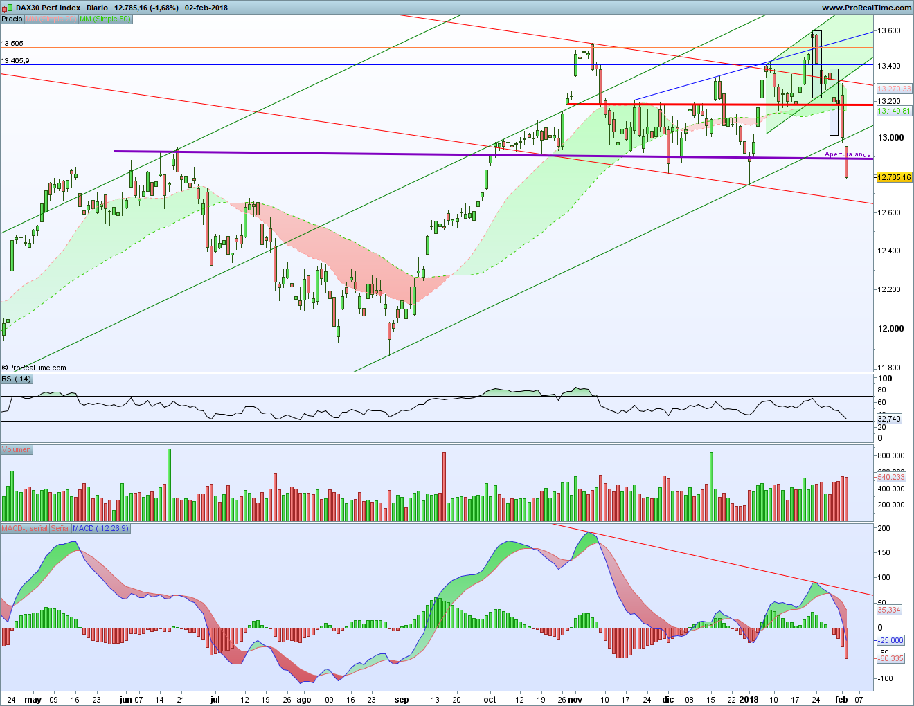 Probablemente el Dax es el índice que más haya visto perjudicada su situación técnica. Porque la caída del viernes ha roto la que era parte baja del tridente alcista desde 2016. Y eso significa que ha acabado esa subida y que estamos en una corrección. ¿De qué tipo? Esto habrá que verlo.