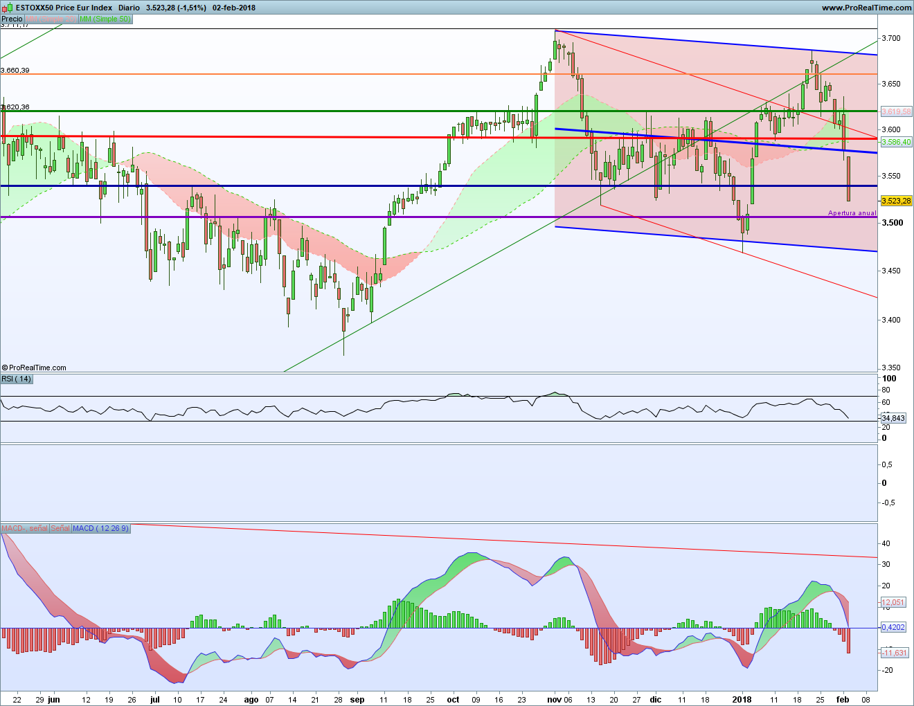 Bolsas Europeas 5 – 9 febrero 2018. Ha bastado el inicio de una corrección en los índices americanos para que los mercados europeos se hayan contagiado y hayan caído con fuerza. Realmente es complicado pensar que si los mercados americanos caen, el dinero vaya a venir a Europa. Otro tema es que puedan comportarse mejor. Pero que Europa suba y los americanos bajen parece complicado.
