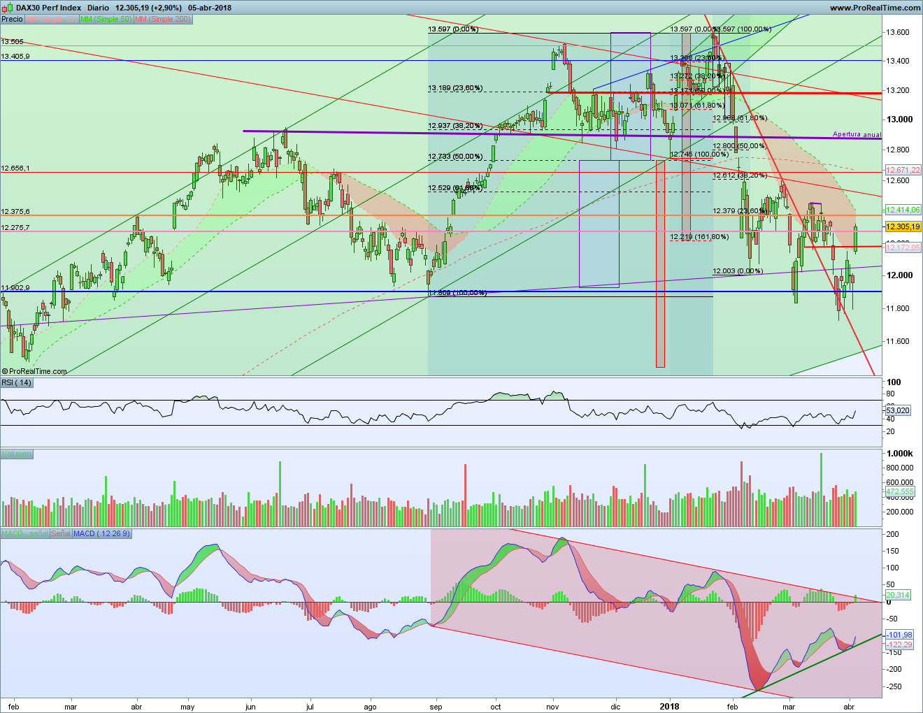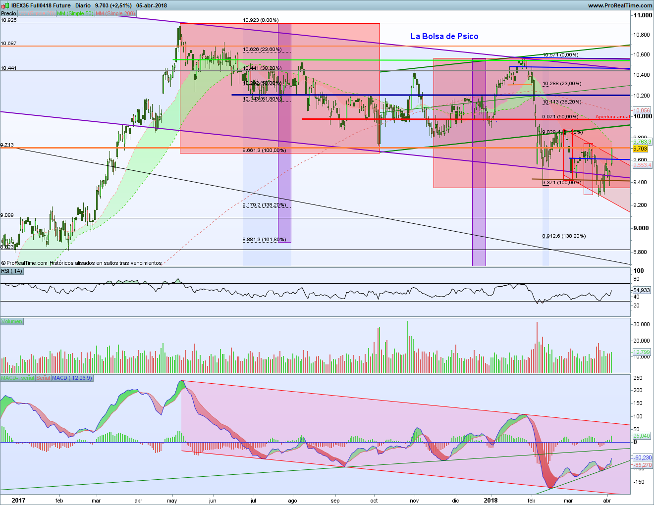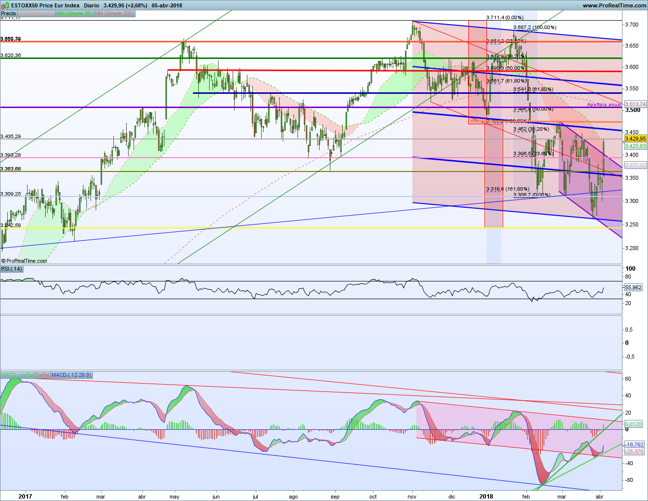 Análisis Técnico de La Bolsa de Psico de las Bolsas Europeas 5 abril 2018. Pues parece que sí, que se había hecho un suelo. Y que las velas de ayer eran alcistas. Esto ha llevado a un rebote muy importante en el día de hoy. Y a romper niveles por arriba.