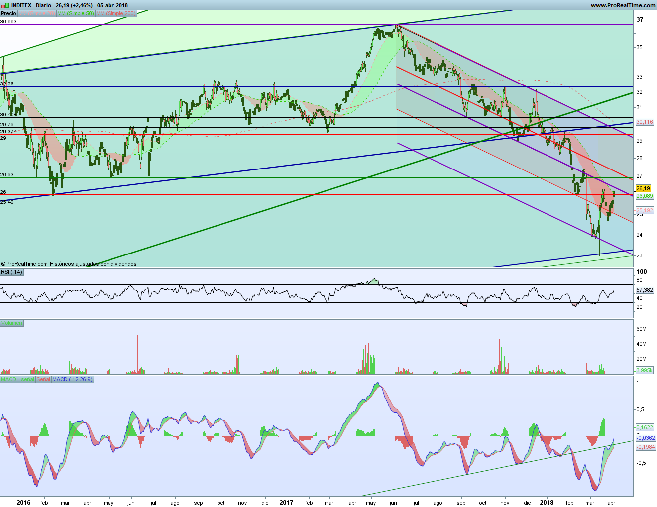 Otro de los grandes del Ibex también ha subido con fuerza hoy. Pero también ha llegado a una zona de resistencia importante. Por un lado estamos en la zona de la resistencia horizontal de los 26 euros. Por otro estamos en la parte central del tridente bajista morado desde máximo del año pasado. Y encima en la MM50.