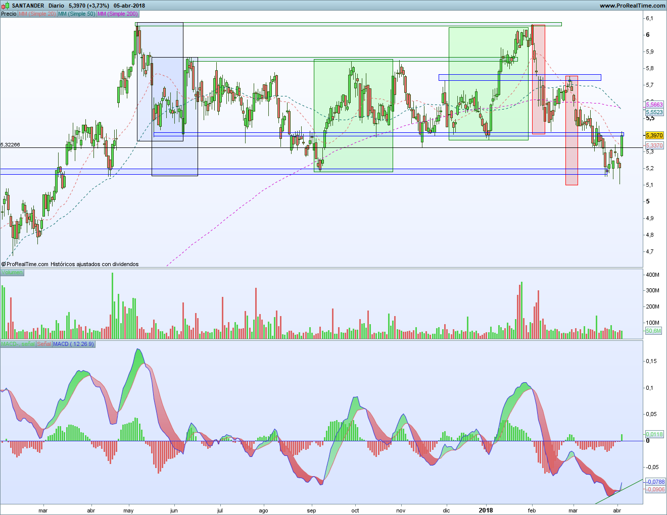 Ayer ya te dije que era muy importante lo que había hecho el Santander. Había cumplido el objetivo de un segundo bajista igual al primero desde el máximo anual. Y después había rebotado con fuerza para dejar una vela en forma de martillo y cerrar por encima del soporte clave.