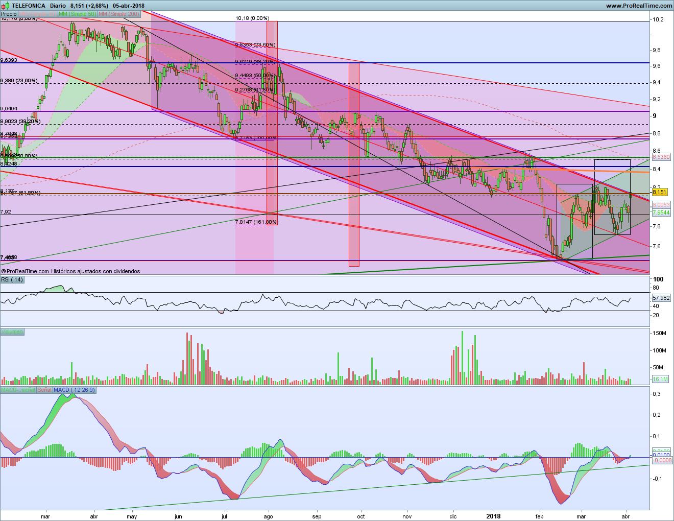 Otro de los pesos pesados del Ibex, Telefónica, también ha subido hoy con fuerza. Pero ha cerrado también en un nivel de resistencia de importancia. Porque ha llegado a la que era parte alta del tridente bajista desde máximos del año pasado.