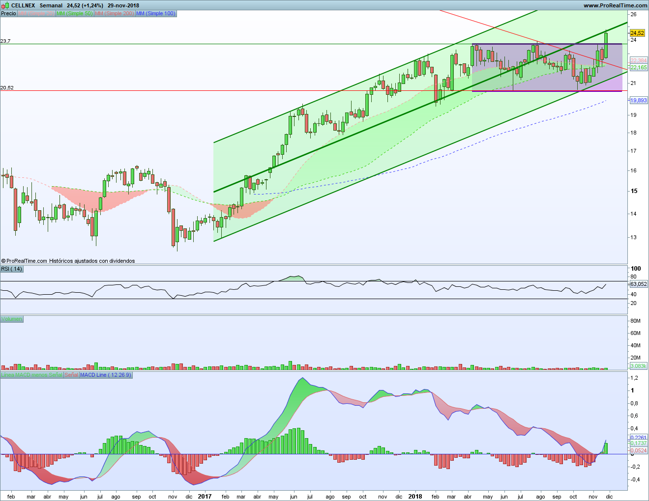 Cellnex: máximos históricos, pero… Desde finales de 2016, Cellnex ha sido un valor claramente alcista. Sin embargo, desde los máximos de abril, máximos históricos, por otra parte, había estado encajonado en un lateral.