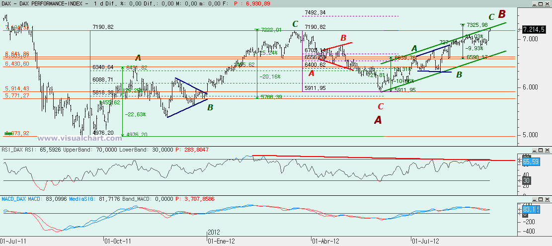 Lo primero es mirar el gráfico desde mínimos de 2011. Desde los máximos de ese año tuvimos una fuerte caída que nos llevó por debajo incluso del 5.000. Pero desde ahí comenzamos a subir llevándonos a superar los 7.000 en marzo. Luego una caída hasta ligeramente por debajo de los 6.000 en junio y desde entonces nueva subida que ya nos deja ya por encima del 7.000 y del máximo de marzo. Pero si vemos este gráfico, todo parece indicar que tenemos patrones que se repiten, y que tenemos series de 3 ondas en ABC desde entonces. Eso quiere decir que parece que todo son correcciones y que no tenemos un impulso en ningún momento. Desde mínimos de septiembre a máximos de marzo tenemos una ABC, con una B en triángulo y una C casi exactamente igual a la A. Luego tenemos una caída también en ABC con la B en triángulo expansivo y una C igual al 162% de la A que corrige entre el 50 y el 61,8% de la subida previa. El problema es que esa corrección es demasiado corta en el tiempo como para pensar que es toda la corrección. Eso y que la subida posterior parece estar haciéndose también en ABC y en canal alcista. Entonces podemos pensar que desde el máximo de marzo podemos estar haciendo una plana con B fuerte, o tal vez una irregular. Esto querría decir que el mínimo de junio habría sido una A y ahora estaríamos haciendo la B fuerte, que si fuera una irregular debería quedarse entre el 101 y el 123.6% de la A, con lo que debería quedarse entre el máximo de junio y el 7.492. Además, como esta B también estaría haciéndose en ABC con la B de nuevo en triángulo expansivo, una C igual a la A nos daría un 7.325. Y después de eso debería venir una C bajista con sus 5 subondas que se hiciera de manera rápida y que nos llevara por debajo del mínimo de junio. Esto implicaría que, después de esa caída tuviéramos otro tramo alcista que volviera a llevarnos, seguramente, por encima del máximo de 2011. Pero eso ya lo veríamos después.