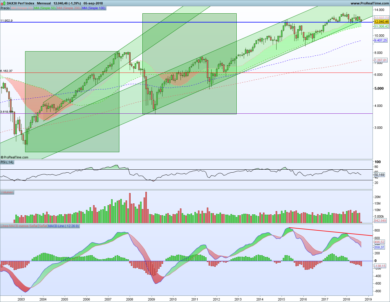 El gráfico del índice alemán es uno de los más perfectos que existe. Sólo así se puede explicar lo que ves en él. Un primer tramo alcista desde el mínimo de 2003 hasta el máximo de 2007 siguiendo un canal alcista. La formación allí de un doble techo que marca el final de la subida y el inicio de una corrección importante. Dicha caída se acelera al perder el nivel de soporte horizontal rojo marcado por el máximo previo en la subida tras dos rebotes al tocarlo.