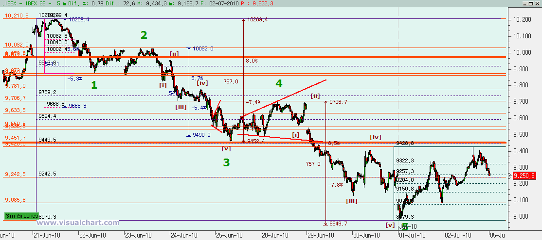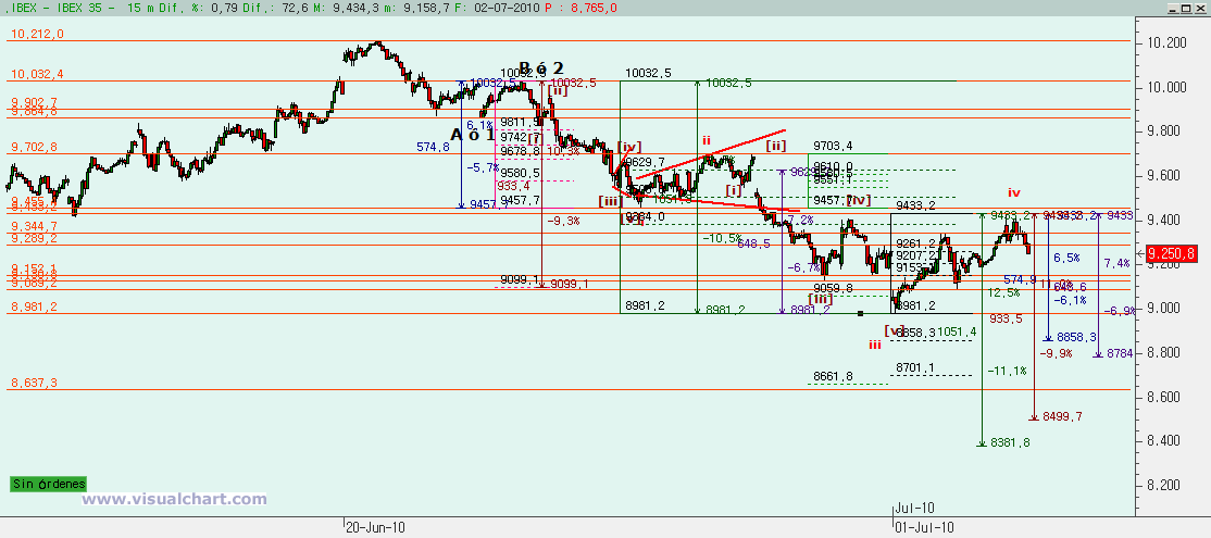 El punto que nos diría que este escenario no es correcto sería la superación de los mínimos de la i en los 8.450 (más filtro). Si mañana rebotamos y superamos esa cota sin antes perder los mínimos de la iii en los 8.980 (o igualarlos), entonces habría que pensar en el otro escenario.