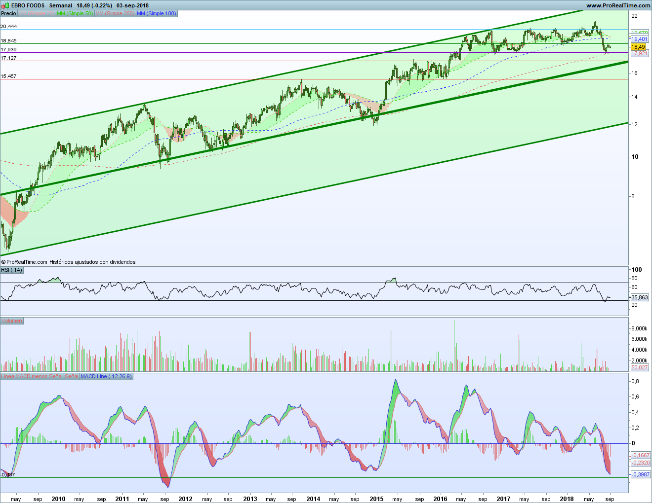 Sin embargo, la rotura fue falsa y el valor inició esa corrección. Pero mira dónde ha llegado la caída. Justo al soporte horizontal en la zona del 17,90 que era la parte baja de ese lateral. Pero es que, además, coincidía con la MM200 de este gráfico semanal. Una media que no se ha perdido desde que se superó a finales de 2009, pese a los intentos a finales de 2014.
