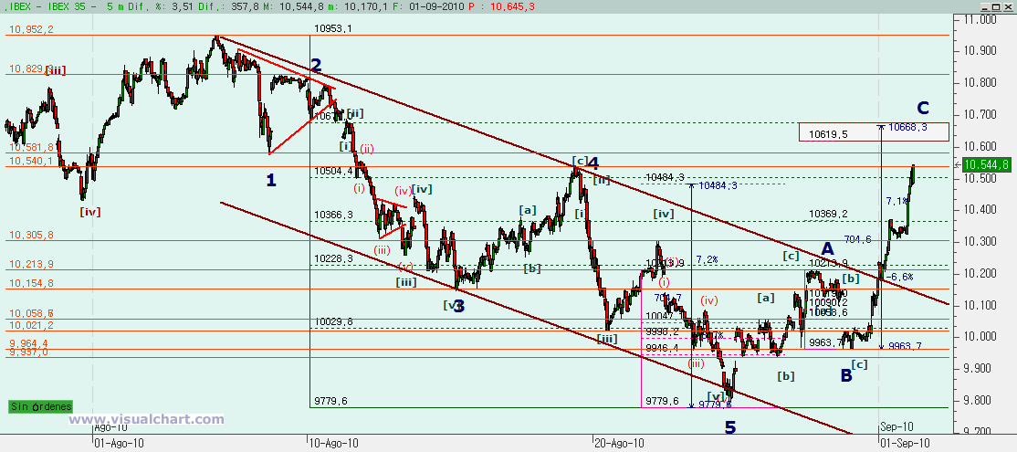 En el gráfico de hoy se hace complicado hacer un recuento con garantías, por lo que vamos a esperar a ver si se va aclarando. Esta C debería formarse en 5 subondas, y parece que podemos medio fijar ya 4, pero en días de subida como los de hoy es mejor no intentar forzar un recuento. Vamos a fijarnos en el siguiente nivel objetivo, entre los 10.668 – 10.678 y veremos qué sucede allí. Sin embargo, antes vamos a ampliar un poco este rango, ya que en los 10.619 está el retroceso del 262% de la onda B señalada. Por tanto, marcaremos el siguiente objetivo alcista entre los 10.619 y los 10.678. Y de esta zona no se debería pasar. Si se pasa, entonces habrá que empezar a cambiar el escenario, al menos a corto.