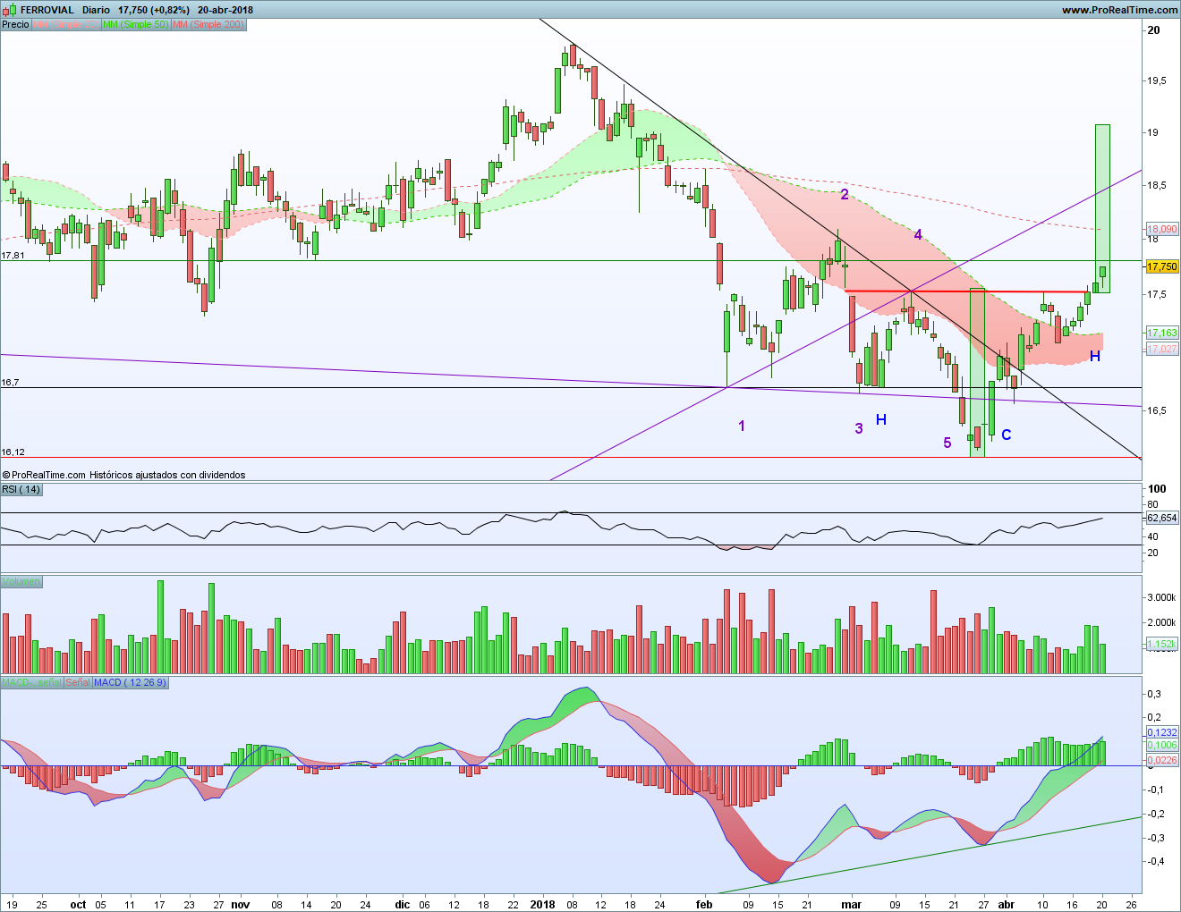 Si la figura es buena, el objetivo alcista estaría por la zona de los 19,10 euros. Es decir, que desde el cierre del viernes daría un 7,6% de subida. Sería interesante ver un throw-back a esa clavicular esta semana y que desde ahí se siguiera con la subida.