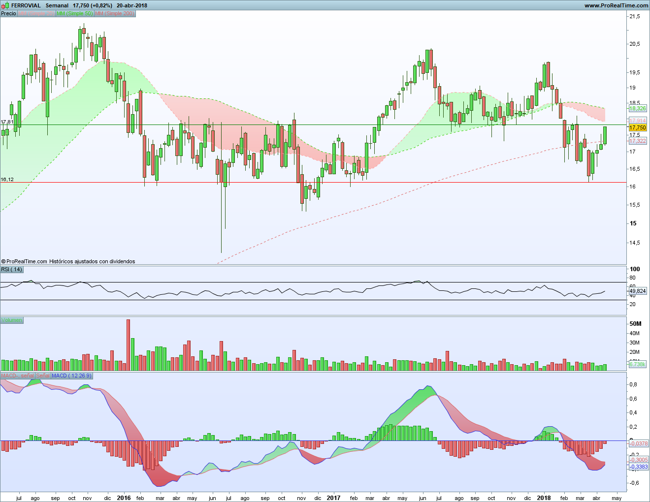 Lo interesante está en el MACD, que está a punto de cortarse al alza. Si lo consigue esta semana, entonces habrá que pensar en continuación de las subidas. Y habrá que marcar la alcista desde el mínimo de febrero de 2016. Casualmente si trazamos en precio desde entonces teníamos la línea de soporte rojo donde se ha producido el rebote.