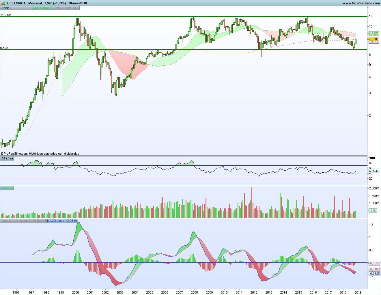Realmente es la parte baja de un lateral en el que está Telefónica desde entonces. Por arriba, el máximo de 2015 tocó la parte alta de ese lateral, coincidiendo con los máximos históricos.
