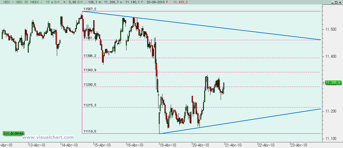A corto hemos marcado otro posible triángulo en el que podemos fijarnos por si estamos de verdad en la 4. Si se sigue este triángulo los próximos días y luego se rompe por arriba, confirmaría este escenario. Si rompemos por abajo y se rompe la directriz marcada por los mínimos de la ondas 2 y 4 de nuestro primer gráfico), entonces el recuento original podría ser el correcto y deberíamos esperar más caídas en las próximas sesiones. Por tanto, mucho ojo a lo que ocurra.
