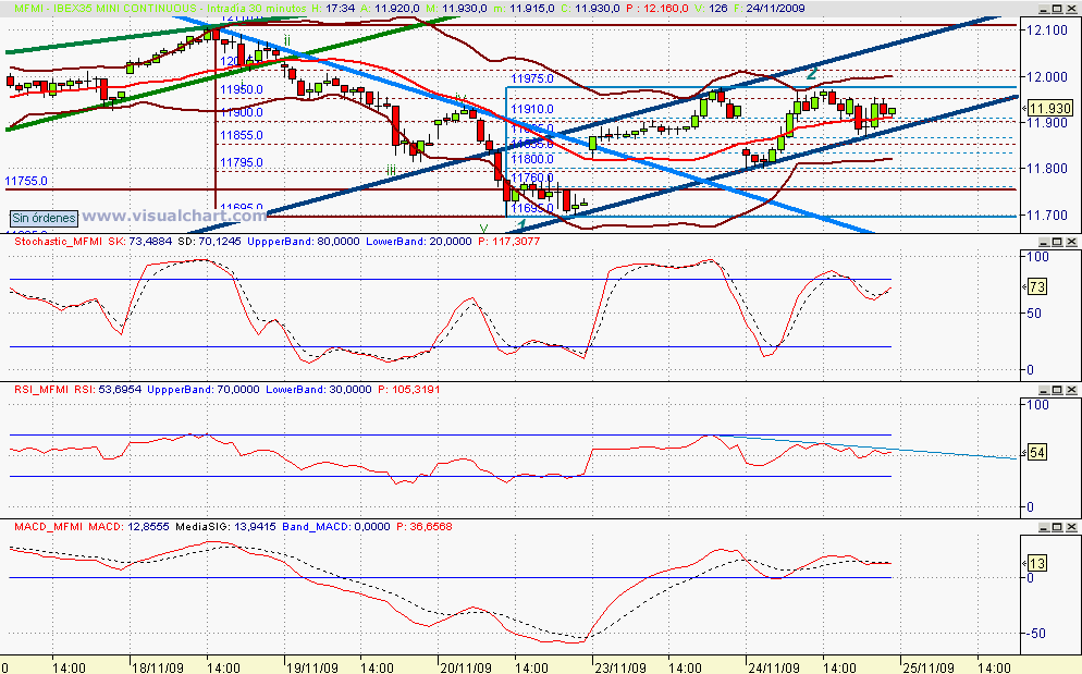 Todo esto nos lleva a decir que no hemos roto por abajo los niveles que podrían confirmar nuestro escenario 1 de ayer, ni tampoco por arriba para intentar descartarlo y pensar en nuestro escenario 2. El jueves es día de Acción de Gracias, y ya sabemos lo que suele pasar esos días… Y para prepararlo, parece que tenemos en el mini Ibex una figura de triángulo ascendente con zona de resistencia clara en los 11.975 y con parte inferior del triángulo en la directriz alcista iniciada ayer y marcada en azul oscuro. Estas figuras suelen romperse por arriba. ¿Se atreverán a hacerlo aprovechando la fiesta americana para marcar nuevos máximos y después pegar el hachazo?