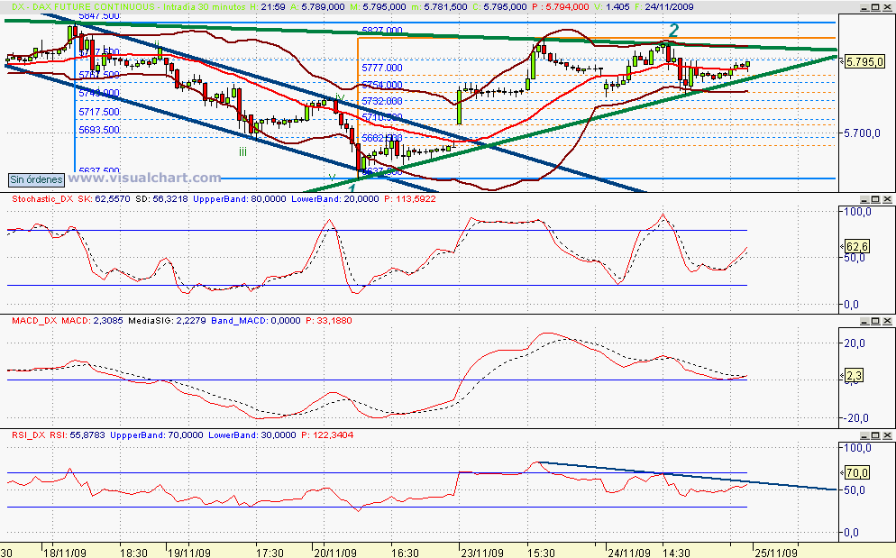 Y mientras tanto, el FDAX nos deja una figura de triángulo simétrico (la marcada en verde). ¿Por dónde romperemos? ¿Qué haremos cuando los yankis estén cerrados y comiéndose el pavo?