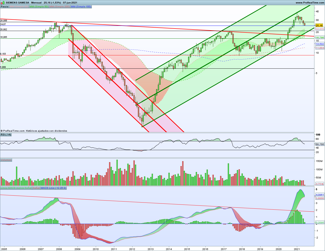 Allí será donde Siemens Gamesa se juega su ser o no ser. Si el tridente aguanta, será el momento de volver a los largos. Si se rompiera, pues mucho cuidado y habría que esperar la formación de un suelo mayor para intentar comprar el valor.