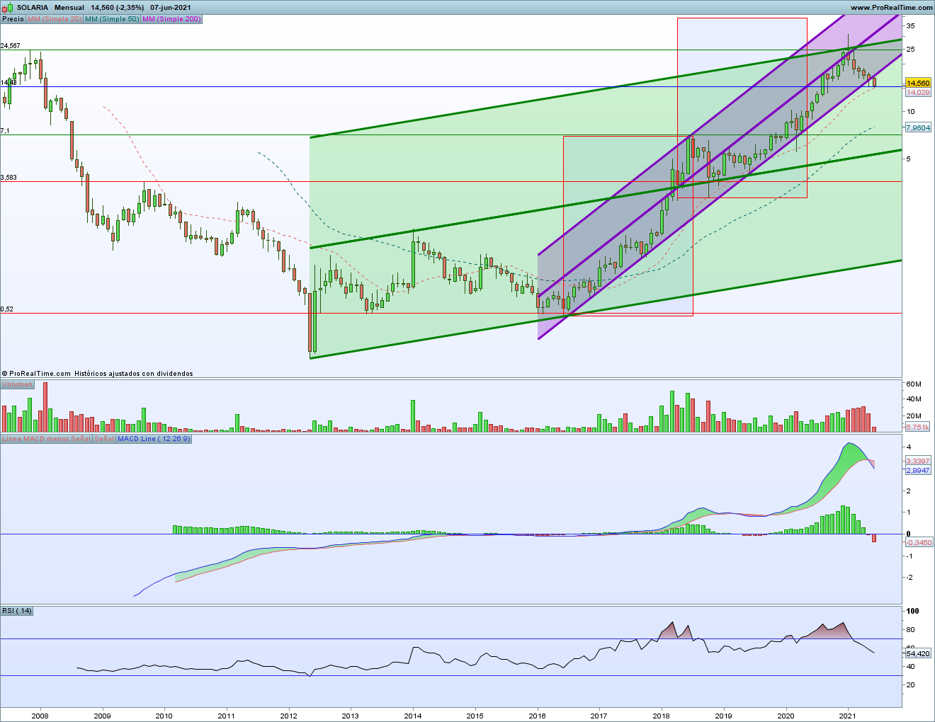 Bueno, pues tras ese giro bajista, el valor ha caído un 53% desde los máximos. Y, por mucho que sea un porcentaje muy importante, ¿se cumplen las condiciones para entrar largo? Pues el caso es que la caída penetró la parte baja del tridente alcista acelerado morado desde 2016. A cierre se consiguió salvar el tridente, pero en lo que va de mes se está volviendo a intentar la rotura. Y si se rompiera, pues, sintiéndolo mucho, habría que olvidarse de Solaria, al menos de momento.
