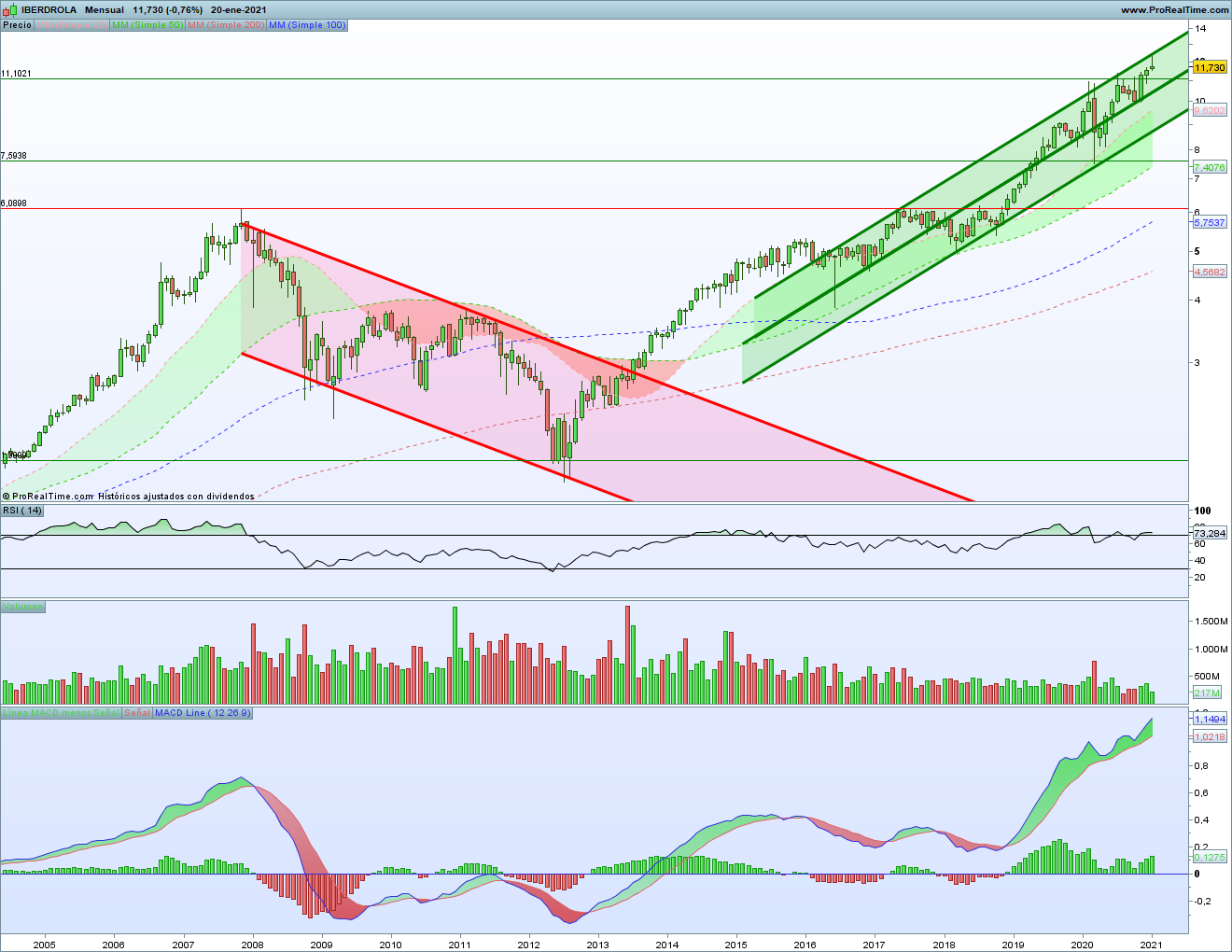 Iberdrola también sufrió la crisis de 2007. Desde máximos históricos se hizo una corrección de varios años hasta el mínimo de 2012. Toda la corrección se hizo en canal bajista, en lo que sería una bandera. Y la superación de la parte alta de esa bandera marcó el final de la corrección.